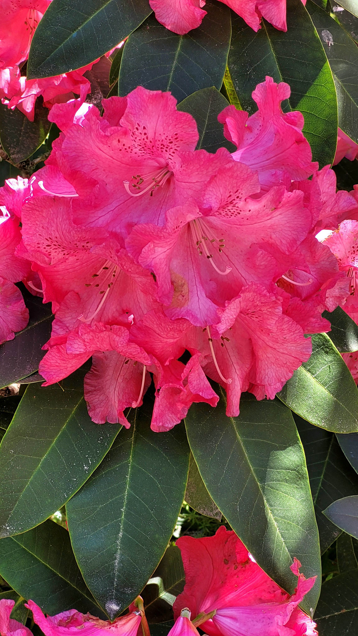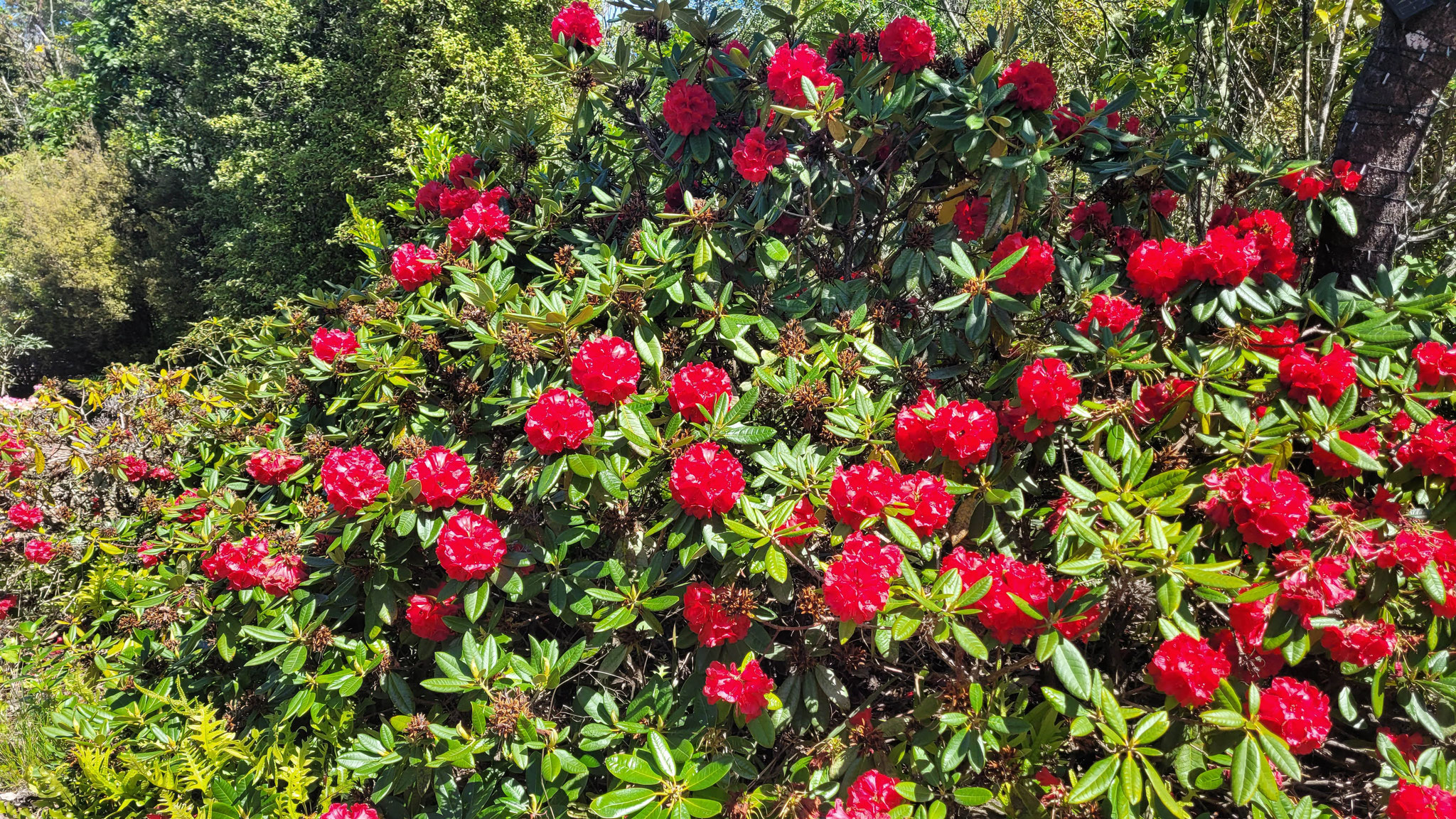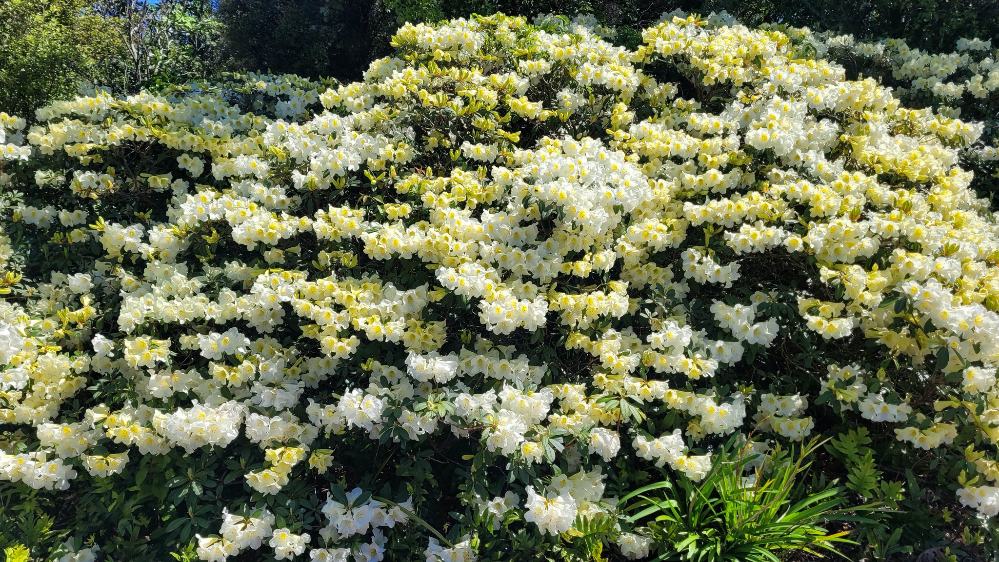 Wir wollen heute eine kleine Wanderung vom Haus aus um die Halbinsel machen. Jane gibt uns dazu noch ein paar Tipps. Los geht’s, zuerst auf der Zufahrtsstraße den Hügel hoch (Schnauf-schnauf), dabei geht es vielen sehr schön blühenden Rhododendronbüschen vorbei. Dann wieder abwärts zum See, durch ein kleines Tor, das von außen mit einem Zahlenschloss versehen ist, damit keine ungebetenen Gäste in die Anlage können.