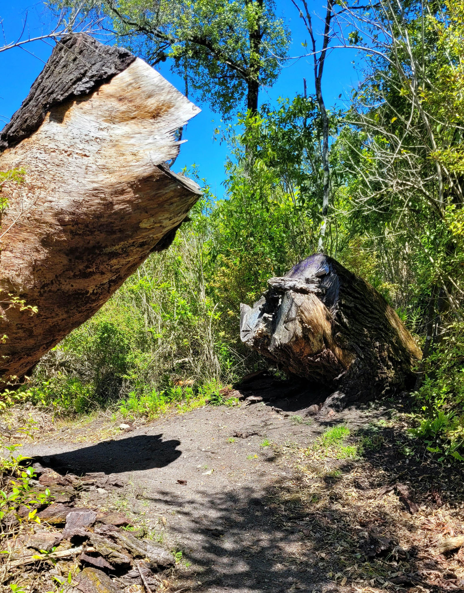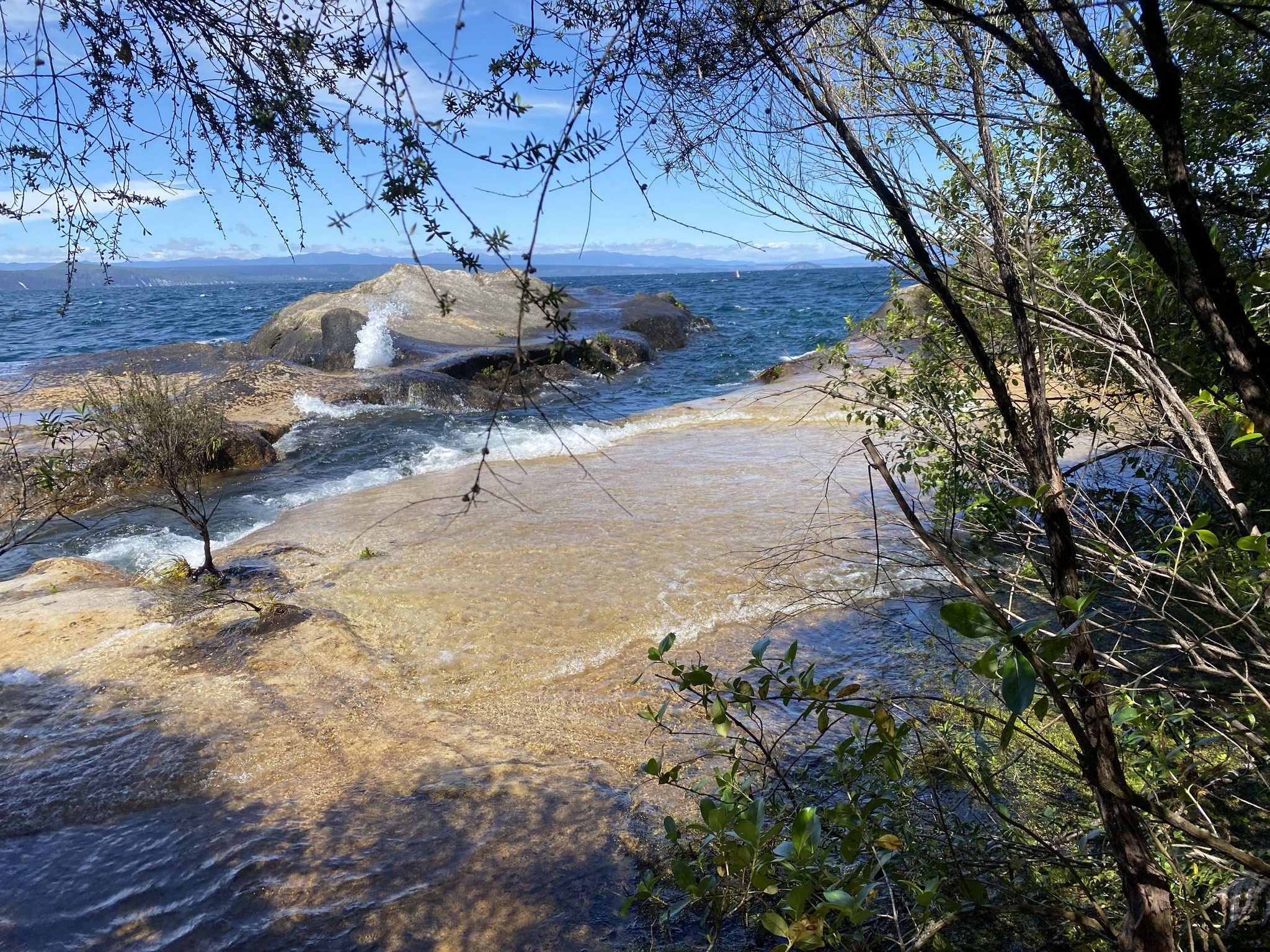 Wir kommen direkt auf den „Flat Rocks“ heraus. Eigentlich müssten wir über die Felsen laufen können, aber das Wasser steht so hoch, dass ständig Wellen über die Felsen spülen. Daran hat Jane nicht gedacht, als sie uns diesen Weg vorschlug. Hinter den Felsen müssen wir uns jetzt erst mal durch das Gestrüpp kämpfen. Bald haben wir das geschafft. Jetzt geht es auf einem schmalen Pfad immer an der Küste entlang. Leider nicht flach, sondern rauf und runter und zum Teil steil.