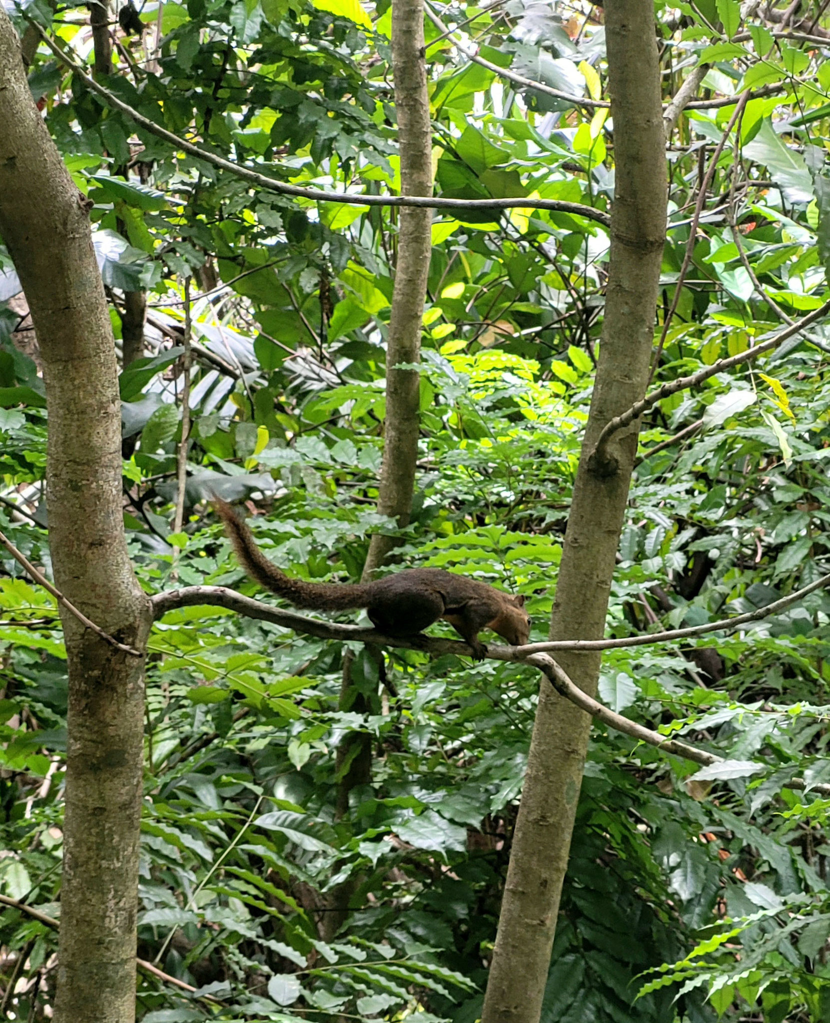 Nach kurzer Zeit kommen uns die Frauen aber wieder entgegen, sie meinen da vorne sitzt ein Affe auf dem Weg, da trauen wir uns nicht vorbei! Das wollen wir natürlich sehen, und die Frauen folgen uns wieder. Bald erreichen wir die Stelle, und tatsächlich direkt über uns in den Zweigen sitzt ein kleiner Affe. Der will mit uns aber überhaupt nichts zu tun haben, und klettert einfach in den Zweigen herum. Schnell sind wir hier vorbei, und die 3 Frauen auch. Das war doch ganz ungefährlich.