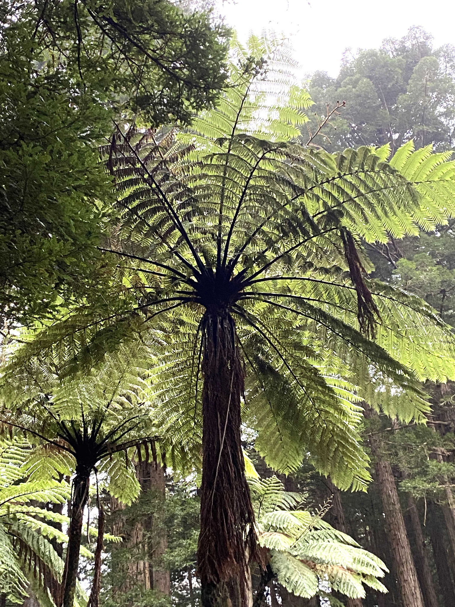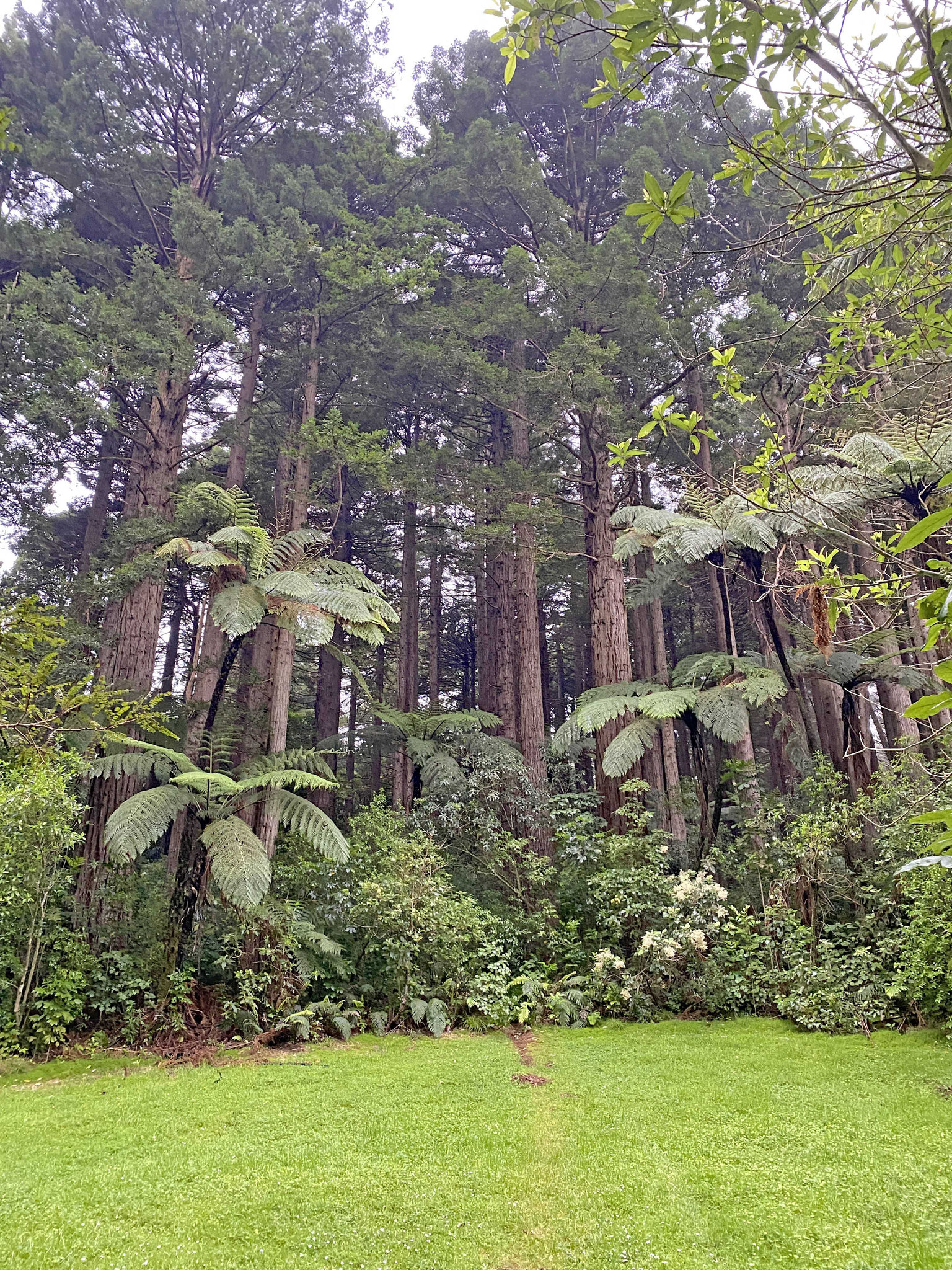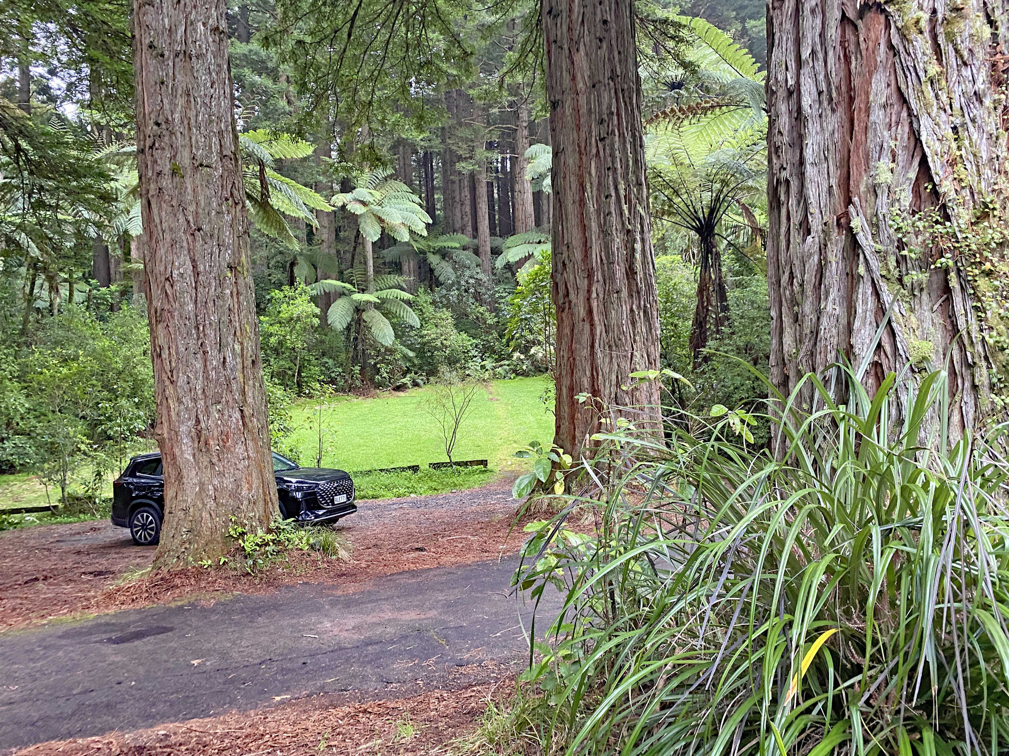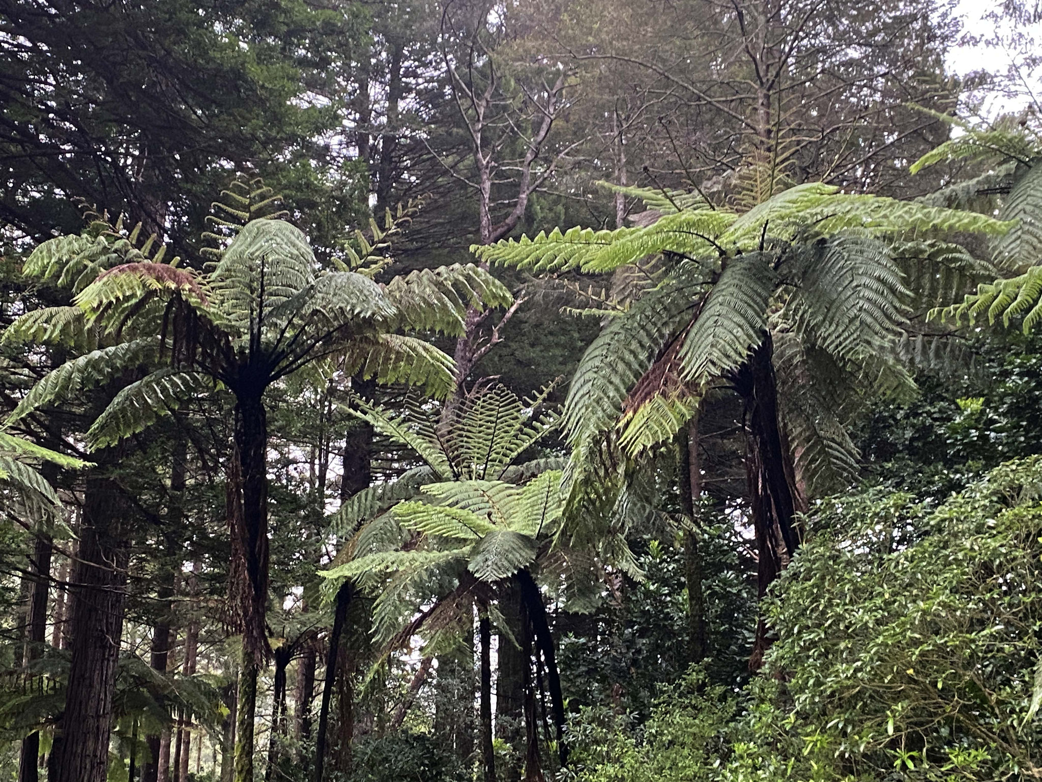 Wir fahren zurück in Richtung zu unserer " Villa". Kurz bevor wir nach links abbiegen in die Ahu Ahu Road sehen wir auf der rechten Seite eine Abfahrt zu Lucy's Gully Picnic Ground im Egmont Nationlapark. Nix wie rein, das sehen wir uns an. Die sehr schmale Straße führt langsam bergauf. Hoffentlich kommt uns hier kein Fahrzeug entgegen. Dann fahren wir in einen richtigen Urwald hinein, links und rechts riesen Bäume und die uns schon so bekannten Riesenfarne. Der Weg endet in einer Wendeschleife mitten im Wald. Toll hier, wir steigen aus und wandern ein bisschen herum.