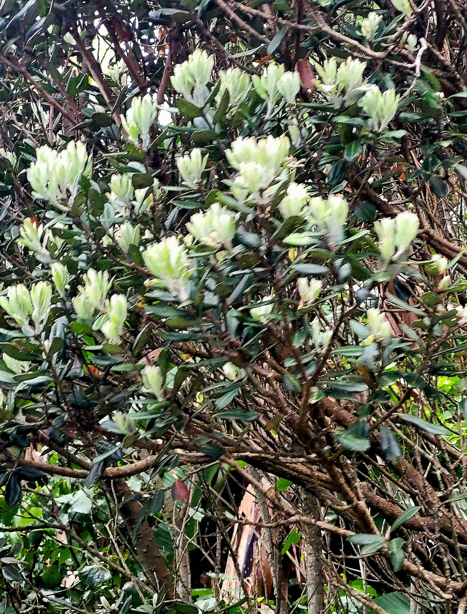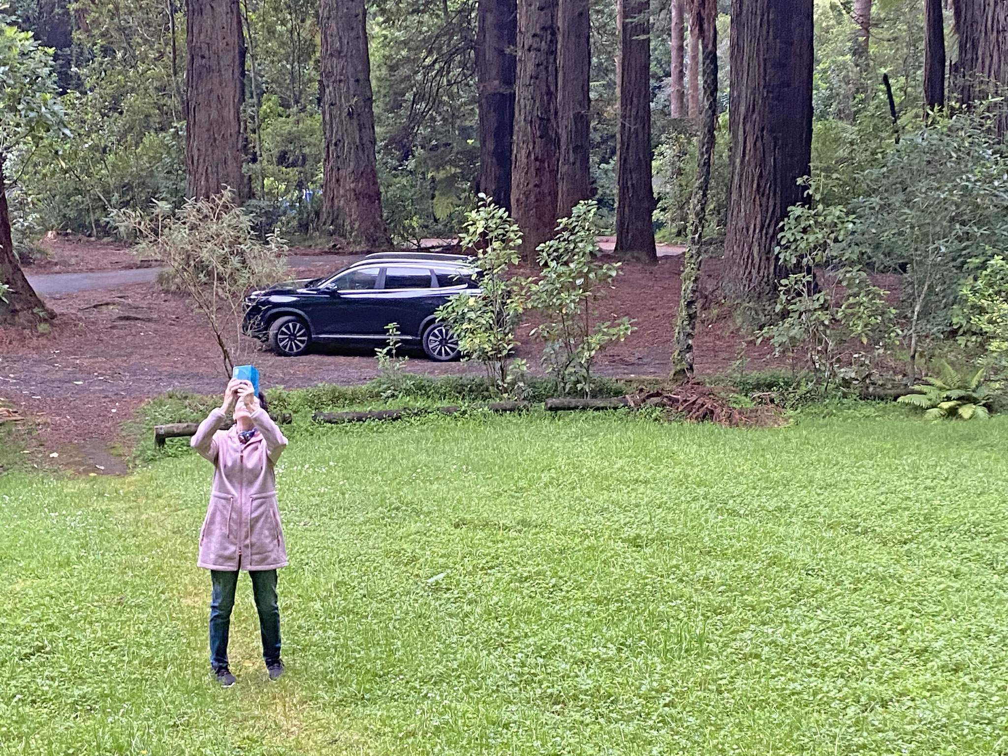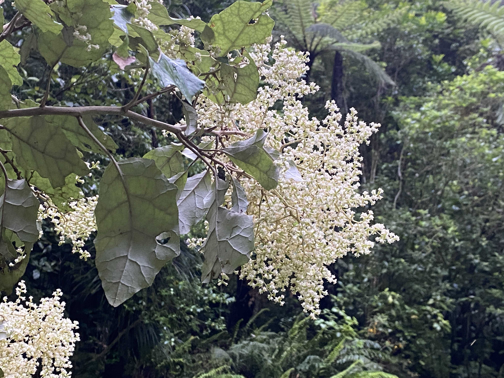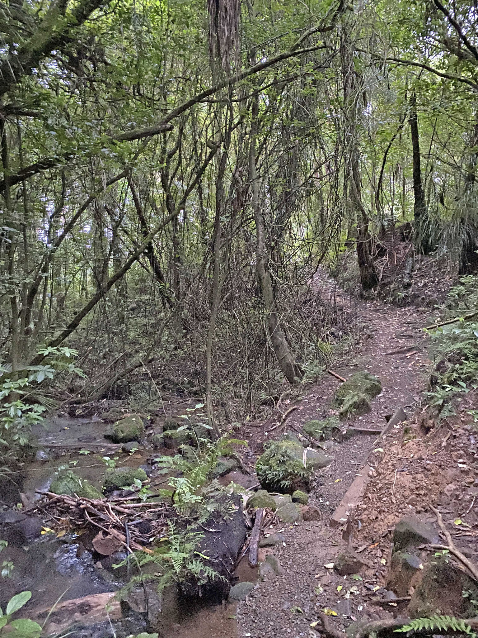Wir fahren zurück in Richtung zu unserer " Villa". Kurz bevor wir nach links abbiegen in die Ahu Ahu Road sehen wir auf der rechten Seite eine Abfahrt zu Lucy's Gully Picnic Ground im Egmont Nationlapark. Nix wie rein, das sehen wir uns an. Die sehr schmale Straße führt langsam bergauf. Hoffentlich kommt uns hier kein Fahrzeug entgegen. Dann fahren wir in einen richtigen Urwald hinein, links und rechts riesen Bäume und die uns schon so bekannten Riesenfarne. Der Weg endet in einer Wendeschleife mitten im Wald. Toll hier, wir steigen aus und wandern ein bisschen herum.