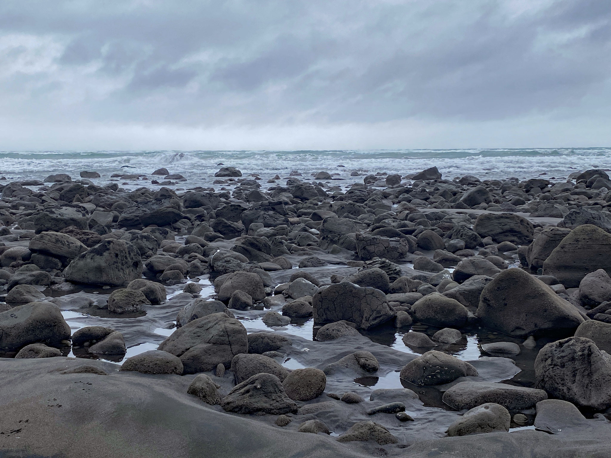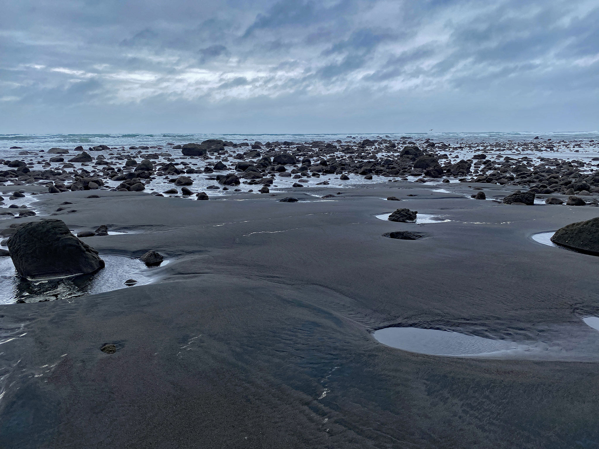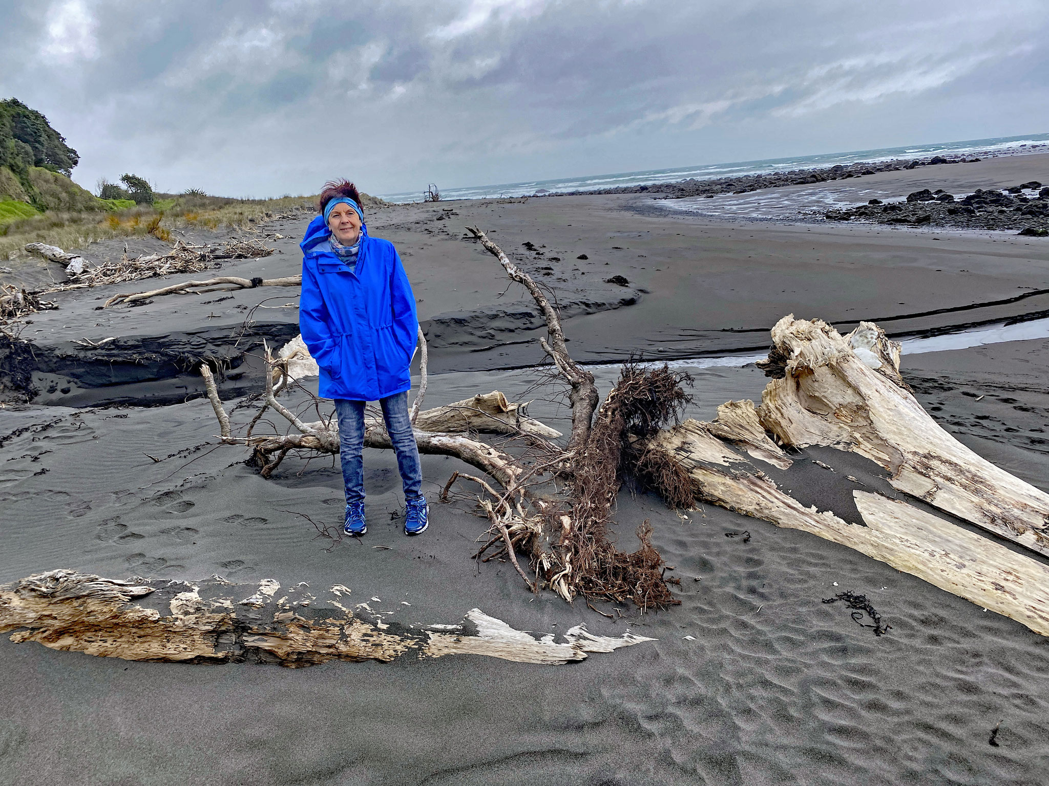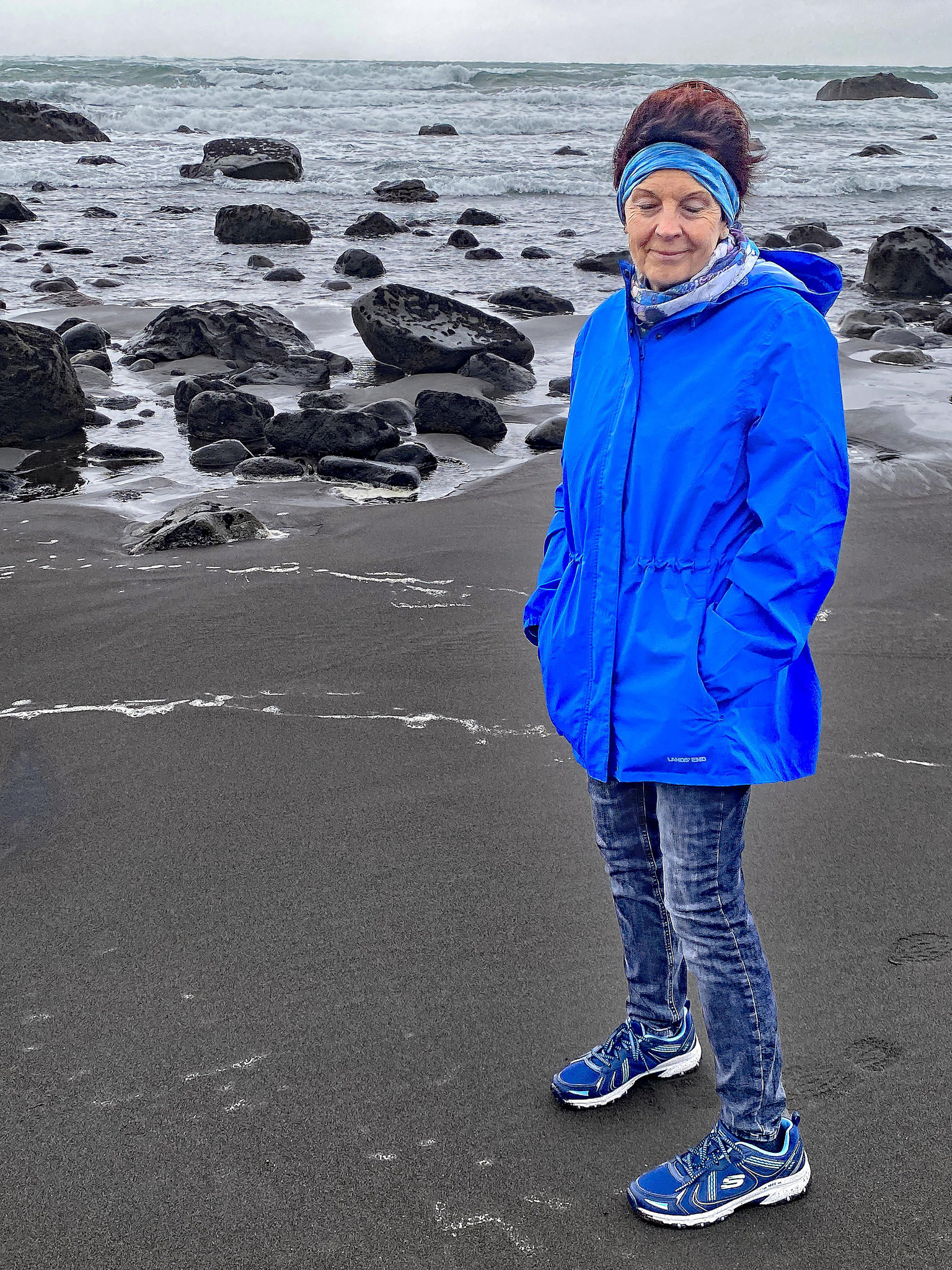 Nach einiger zeit brechen wir auf zum Strand. Natürlich wollen wir uns hier das Meer und den Strand ansehen. Leider ist es immer noch grau, und der Wind weht uns heftig um die Nase. Aber es ist sehr schön hier die wilde Natur zu erleben. Zur Zeit ist gerade Ebbe, so dass wir über den schwarzen Sand bald zum Wasser kommen.