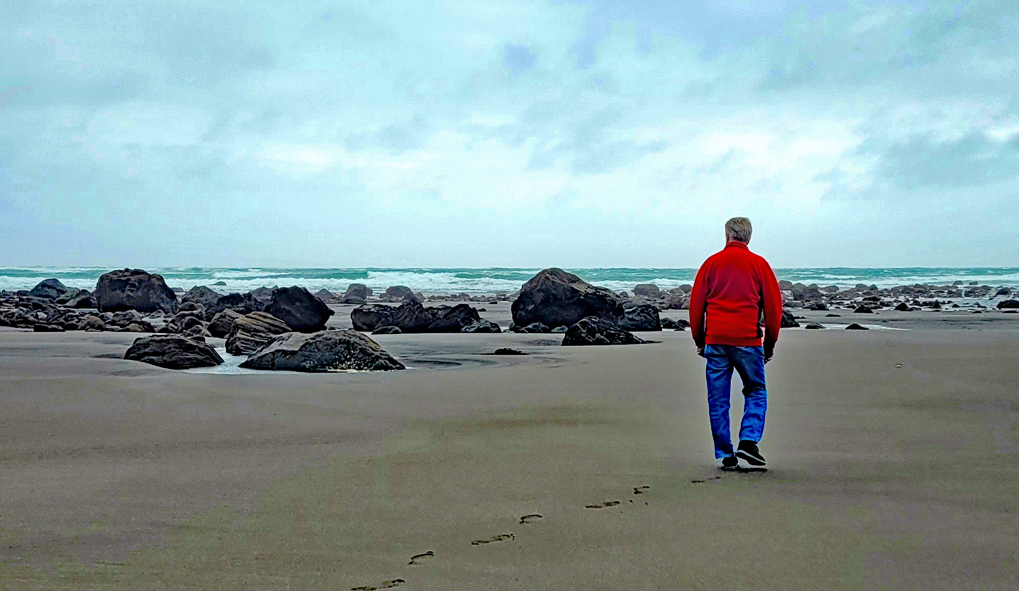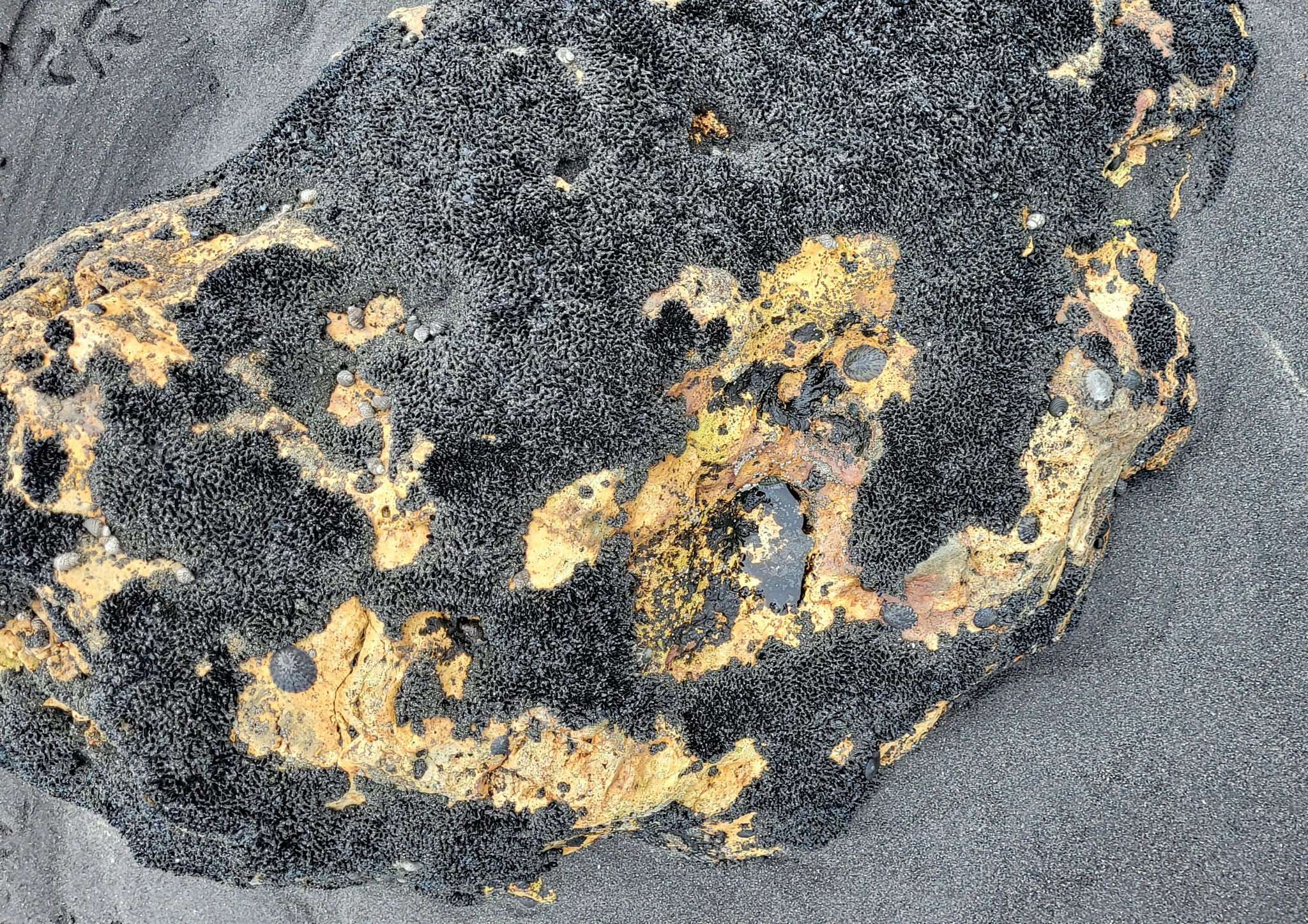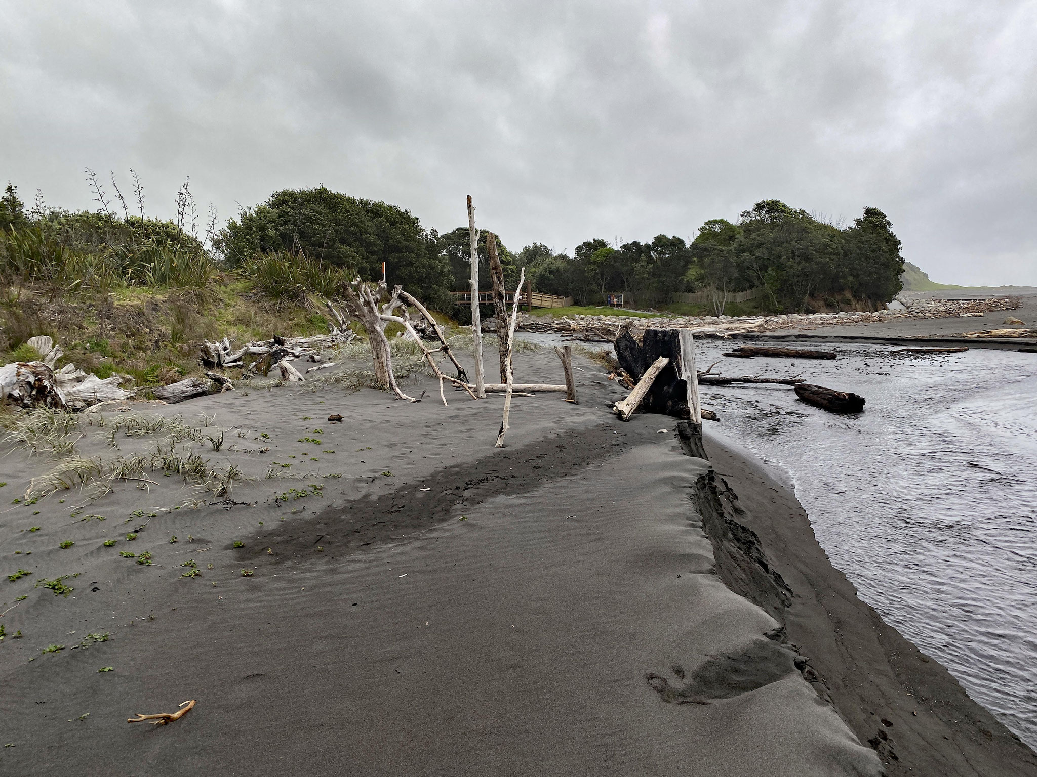 Nach einiger zeit brechen wir auf zum Strand. Natürlich wollen wir uns hier das Meer und den Strand ansehen. Leider ist es immer noch grau, und der Wind weht uns heftig um die Nase. Aber es ist sehr schön hier die wilde Natur zu erleben. Zur Zeit ist gerade Ebbe, so dass wir über den schwarzen Sand bald zum Wasser kommen.