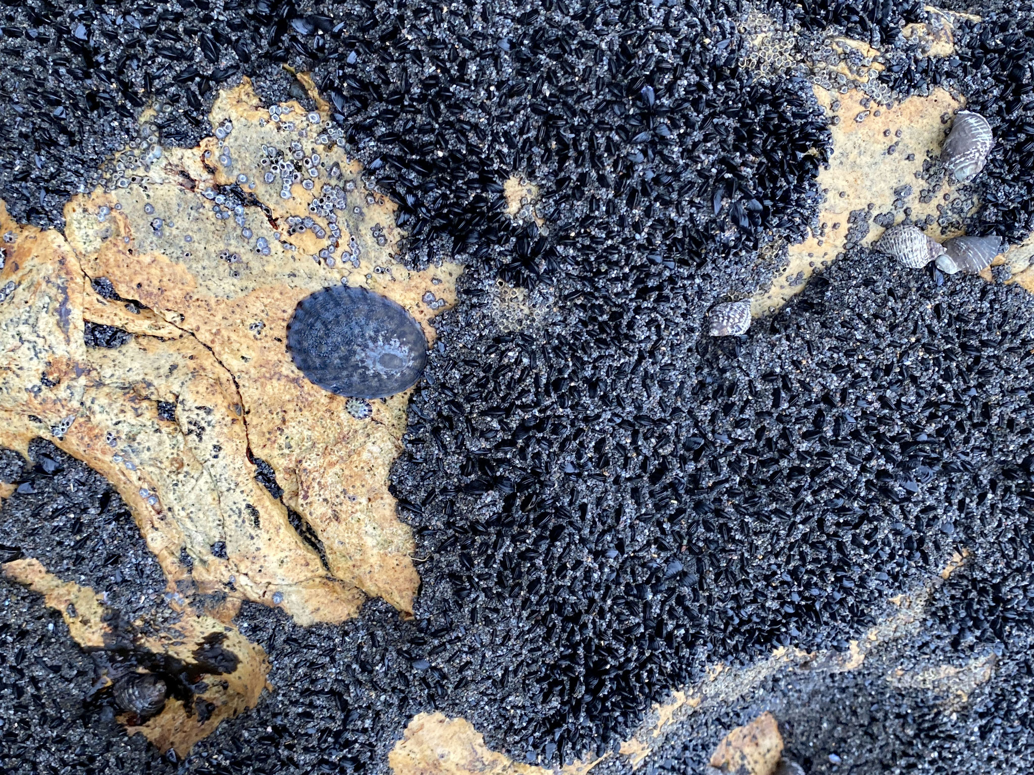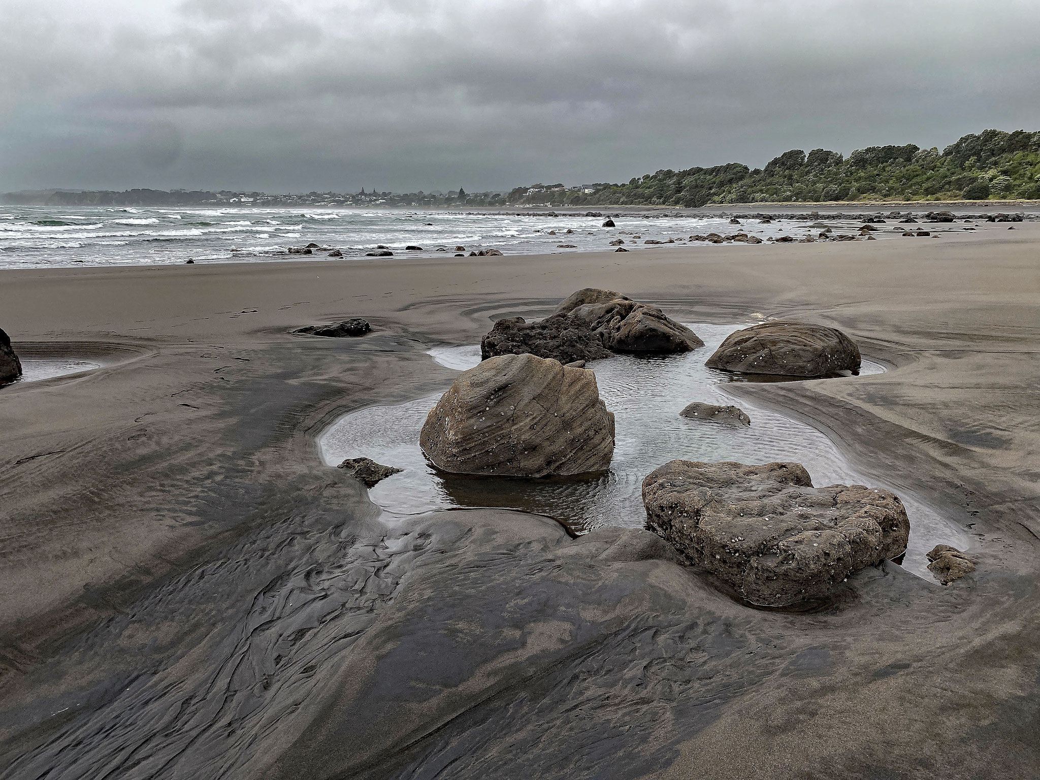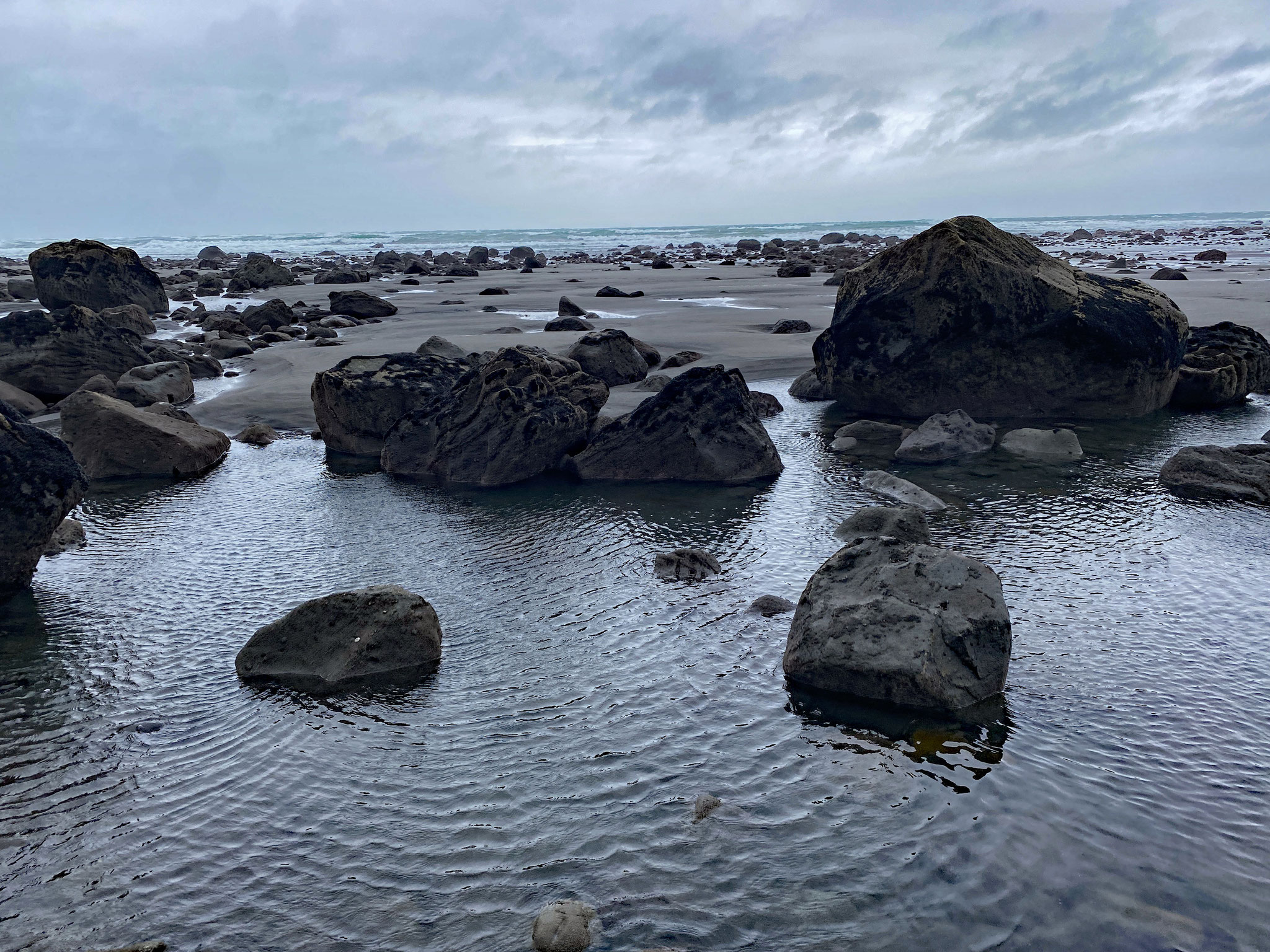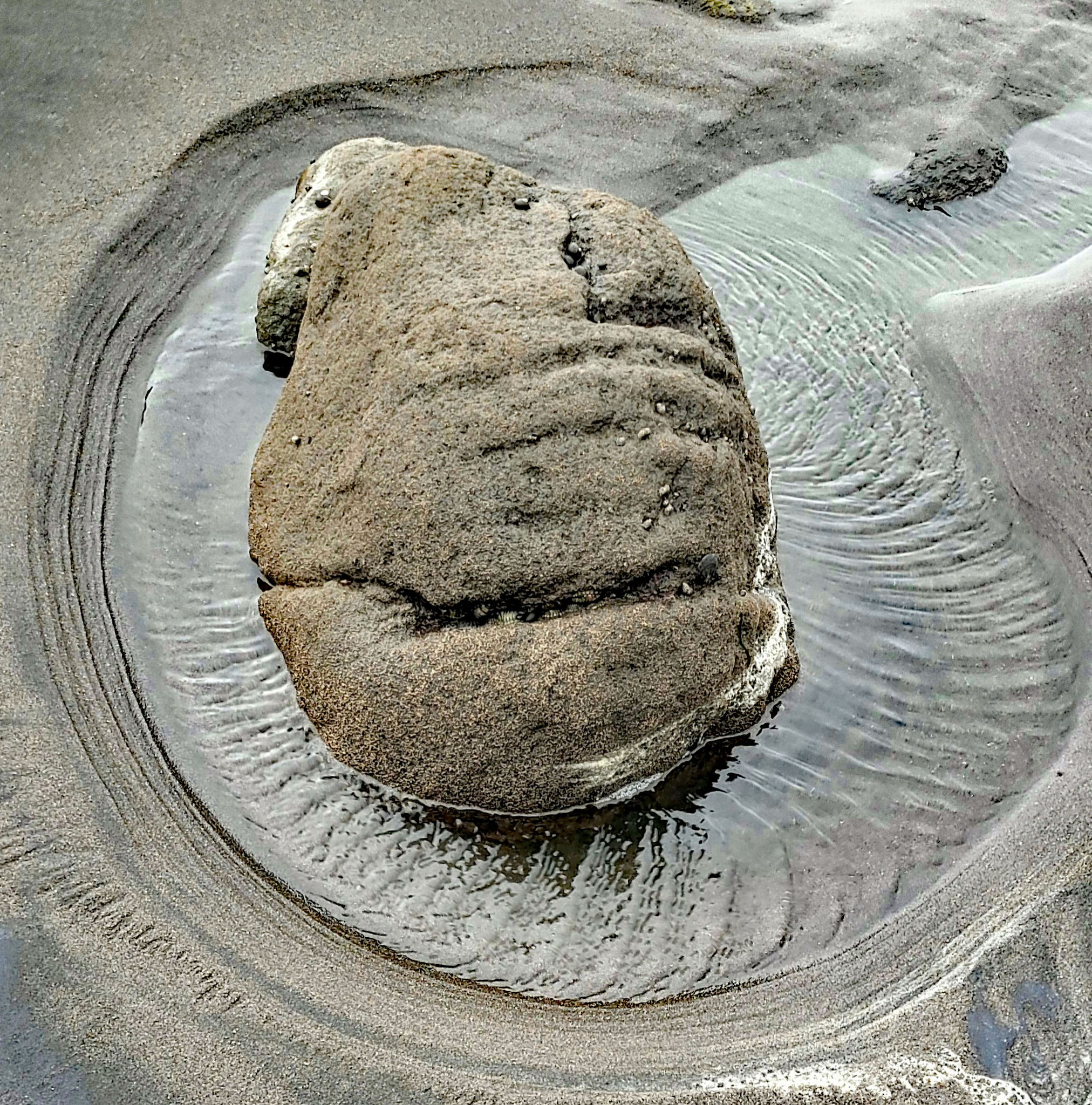 Wir laufen einfach mal am Wasser entlang zwischen den Steinen an denen vorbei kleine Bäche fließen durch das bei Ebbe abfliesende Wasser. Wir müssen nur aufpassen, dass wir durch das Wasser nicht vom Strand abgeschnitten werden. Ich gehe langsam zurück. Margit traut sich nicht über einen etwas breiteren Bach zu steigen, ich bin vorher kurz im nassen Sand eingesunken, so dass mir der schwarze Sand oben in die Schuhe hineingelaufen ist. Das will sie nicht nachmachen.