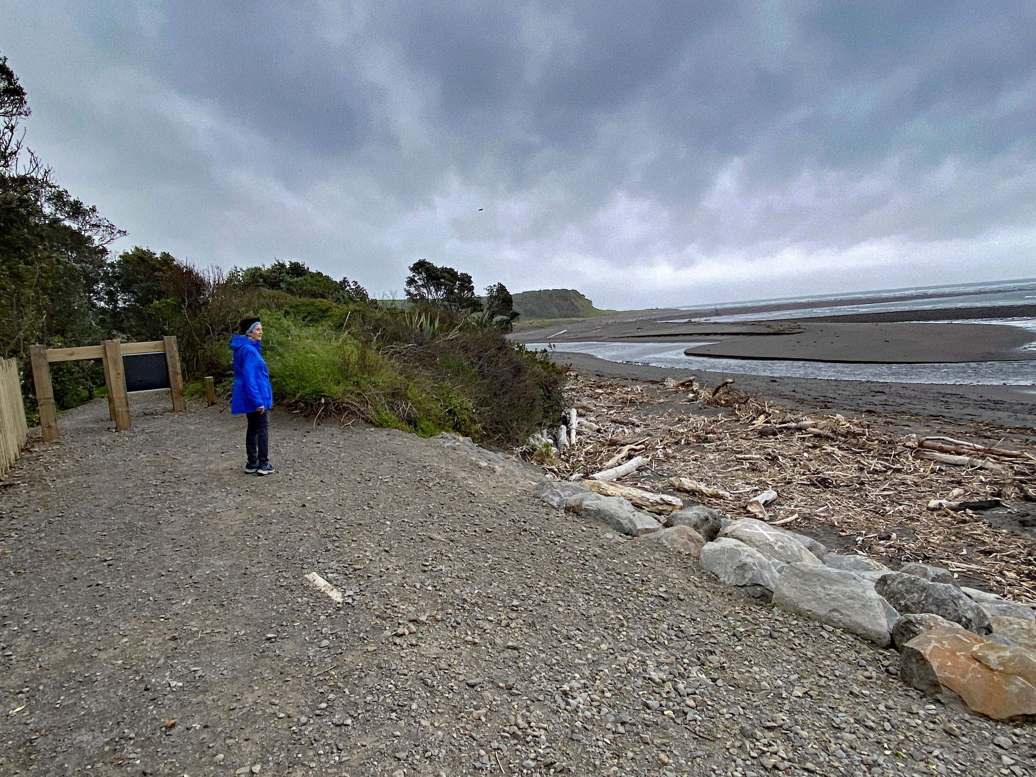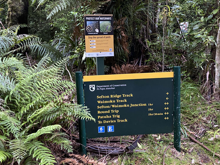 Bei den Riesenbäumen handelt es sich um die, nur hier zu findenden, Kauri Bäume. Wir entdecken einen Wegweiser, auf dem verschiedenen Wanderungen angezeigt sind. Morgen wollen wir das mal probieren, wenn das Wetter mitspielt.